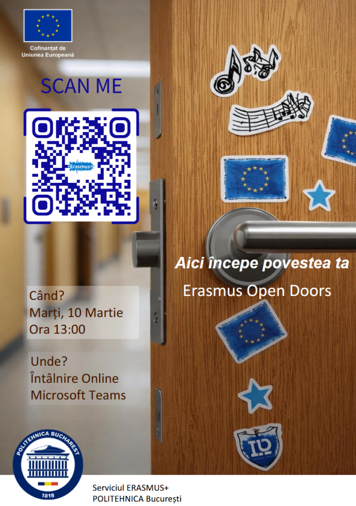 Dragi studenti, sunteti asteptati la evenimentul organizat de Biroul Erasmus al Politehnicii Bucuresti. Evenimentul se va desfasura Marti, 10 Martie, ora 13:00. Link-ul intalnirii este: https://qrto.org/zD2YTV